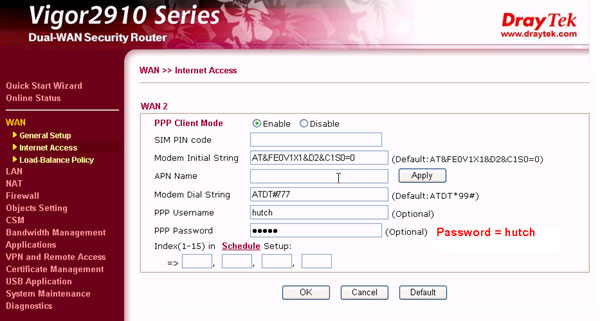 1.4  ที่หัวข้อ PPP Client Mode เลือกเป็น Enable หัวข้อ Modem Dial String ใส่ค่า ATDT#777  ช่อง PPP User Name = hutch  และ PPP Password = hutch  ตามภาพด้านล่าง  หลังจากใส่ค่าเสร็จเรียบร้อยแล้วกดปุ่ม OK