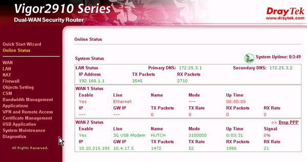 จากการทดสอบใช้งานพบว่า  สัญญาณที่ได้เฉลี่ย  โดยประมาณจะอยู่ในช่วง 400-700 kbps จริง  แต่ Speed ในการ Upload นั้นไม่มากนัก  รุ่นของอุปกรณ์ที่ ใช้งานกับ Vigor 2910 และ Vigor 2820 ได้คือ Huawei EC226 และ Hutch EC121  วิธีติดตั้งใช้งานกับ DrayTek ตามด้านล่างนี้  (สามารถติดตั้งใช้งานได้ภายใน 2 นาทีเท่านั้น)